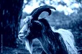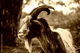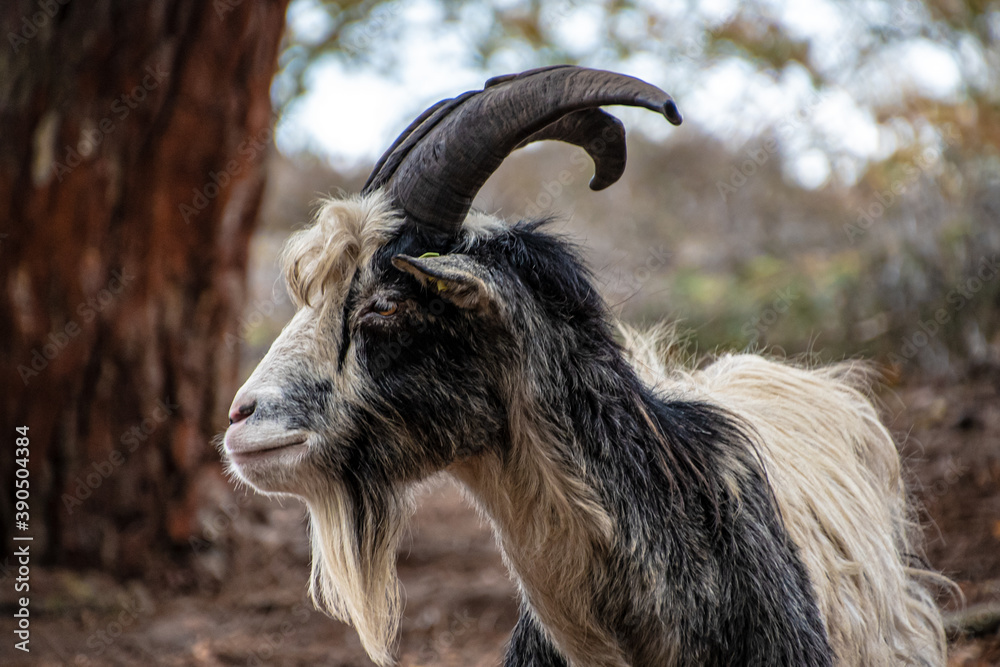 Goat with beautiful hair and long horns on The Goat Farm in autumn