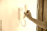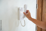 People holding phone for intercom display near the entrance door for connecting at home.