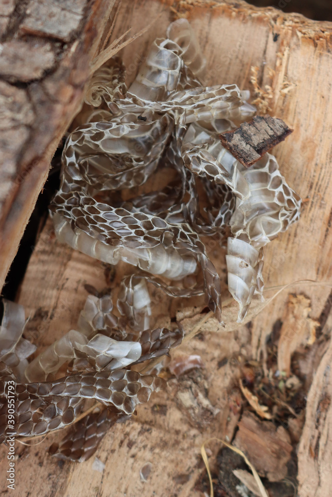 Dropped dry snake skin after the moultin on a wood log