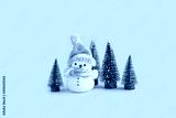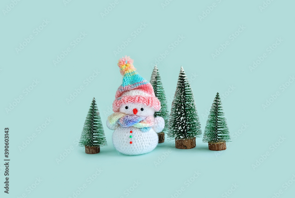 cute snowman and decorative christmas tree on blue background. Christmas and New Year holiday concept. winter festive season.