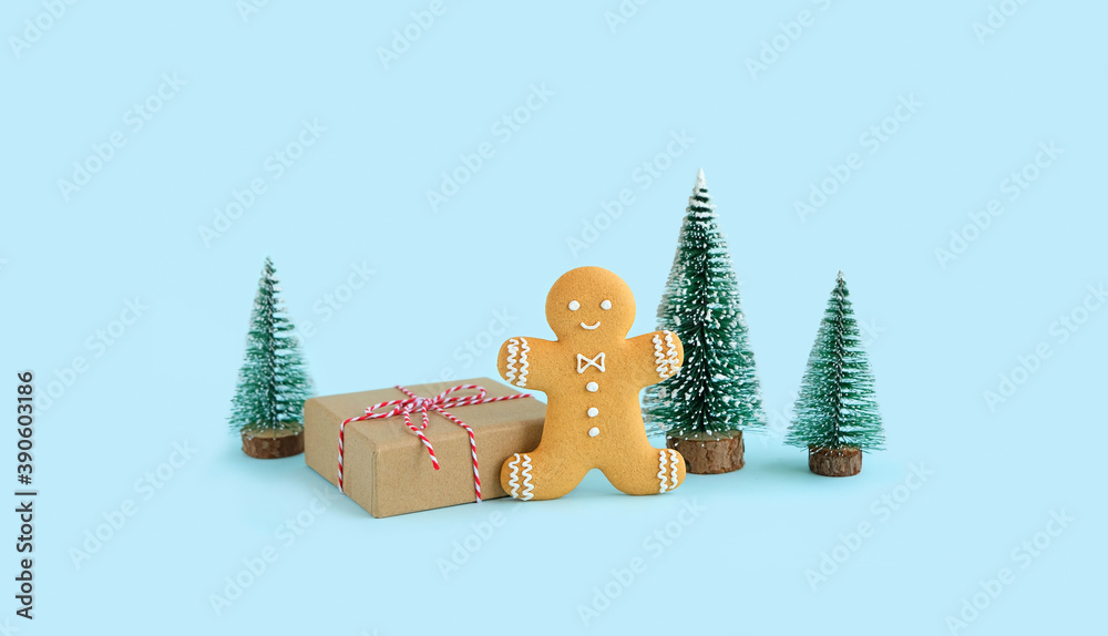 cute gingerbread man, gift box and christmas tree on blue background. Christmas and New Year holiday concept. winter festive season
