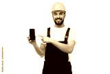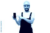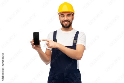 profession, construction and building - happy smiling male worker or builder in yellow helmet and overall showing smartphone over white background