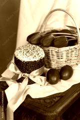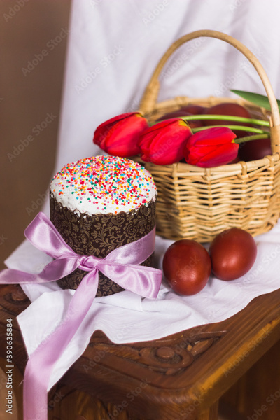 Easter still life with Easter cake decorated with a purple bow, a basket of eggs and tulips. Wooden carved bench. Easter holiday greeting card invitation poster banner