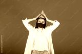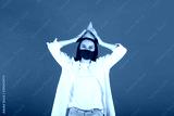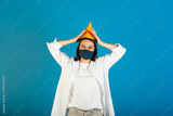 Celebration birthday during coronavirus. Young pretty woman in yellow birthday hat and medical mask is laughing. Studio portrait with blue background.