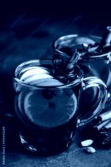 Christmas Mulled Wine with spices and fruits on a dark background, copy space.
