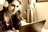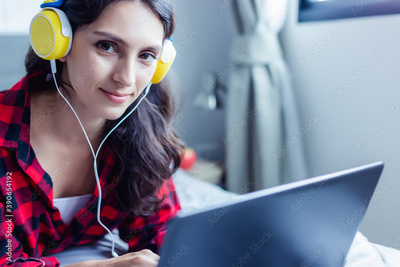 Beautiful woman listening music on laptop computer on bed at home or she watching movie on website by using internet online service and wireless, she wears headphones. Pretty girl look at camera