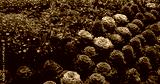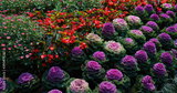 Ornamental kale with white, pink, and green leaves. Flowering decorative purple-pink cabbage plant in garden.