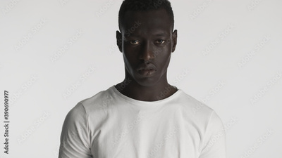 Angry African American guy wearing t-shirt looking aggressive on camera with over white background