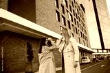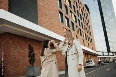 Two stylish girlfriends with glasses greetings with elbows on the city street. Don't shake hands. Elbow greeting style during coronavirus.