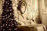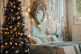 Beautiful holiday decorated bedroom with Christmas tree with white toys and garland on the white wooden wall.