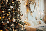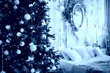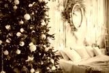 Beautiful tender Christmas bedroom with decorated Christmas tree, gifts and white wooden wall.
