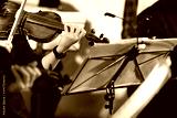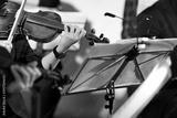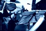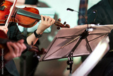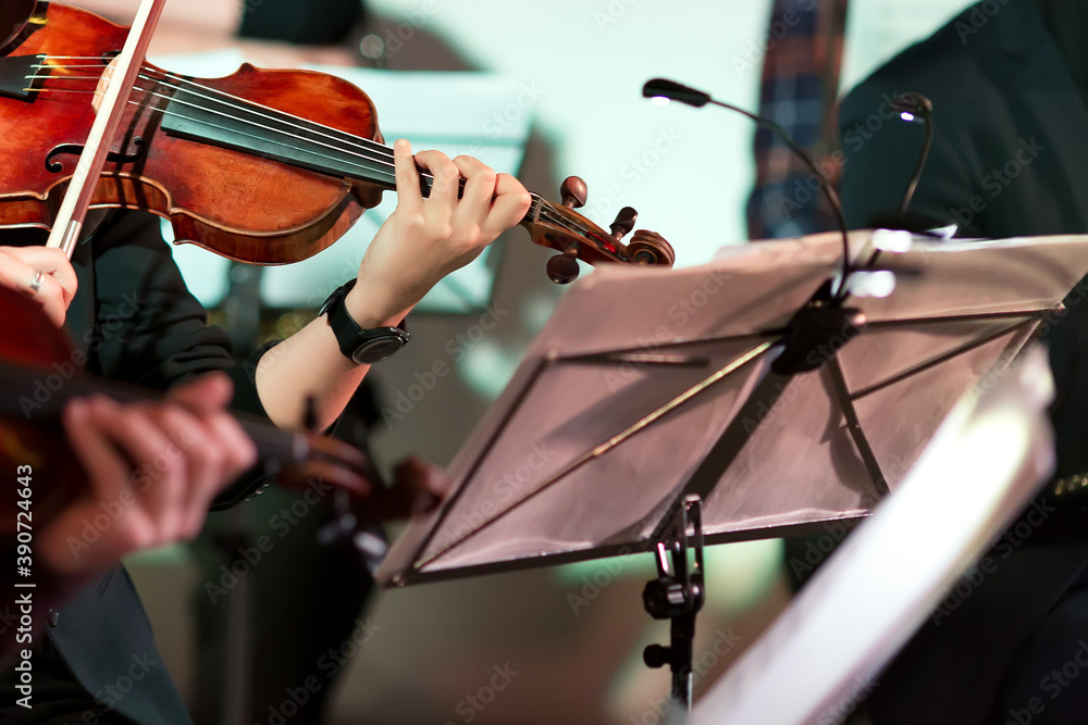 Symphony music. Woman playing the violin in orchestra near music note stand