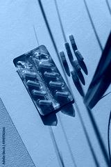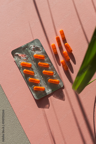 pills, tablets or capsules in blister on pink background close-up top view flat lay. Concept of modern medical treatment, pharmacy, healthcare. Abstract composition with plant leaves