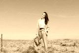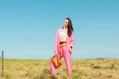 Young model woman wearing fashionable pink pants and glasses posing by the grass and blue sky playing with her long hair. Cute modern European model girl enjoys a walk on the beach. Spring summer