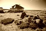 A brick small house on the grassy shore of the White sea and huge cobbles in the foreground on Solovetsky Islands, Russia.