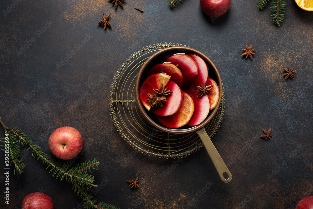 Winter mulled wine with orange, apple, cinnamon and anise star,