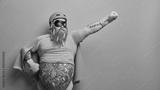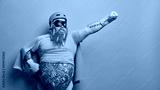 Self confident serious bearded man ready to help people wears superhero costume pretends being heroic character has supernatural power stretches arm over blue background with empty blank space