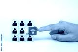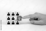 Close up hand choosing a light bulb on people icon on cube wooden toy blocks concepts of human resources for business team organizations and leadership.