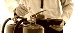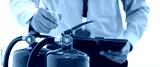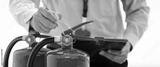 Fire protection engineering checking inspection services the red fire extinguishers tank in the building concepts of prevent emergency and safety rescue and fire training.