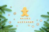 happy december. gingerbread man, snowlakes, letters and fir tree. winter festive season. Christmas and New Year holiday background.