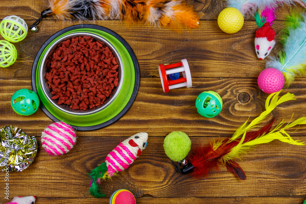 Set of toys for cat and bowl with dry pet food on wooden background. Top view. Pet care concept
