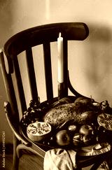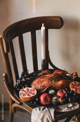Whole oven roasted duck in ripe seasonal fruits for Thanksgiving holiday or Christmas eve party celebration on tray over wooden stool, top view. Traditional Autumn or Winter holiday comfort food