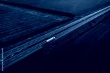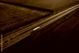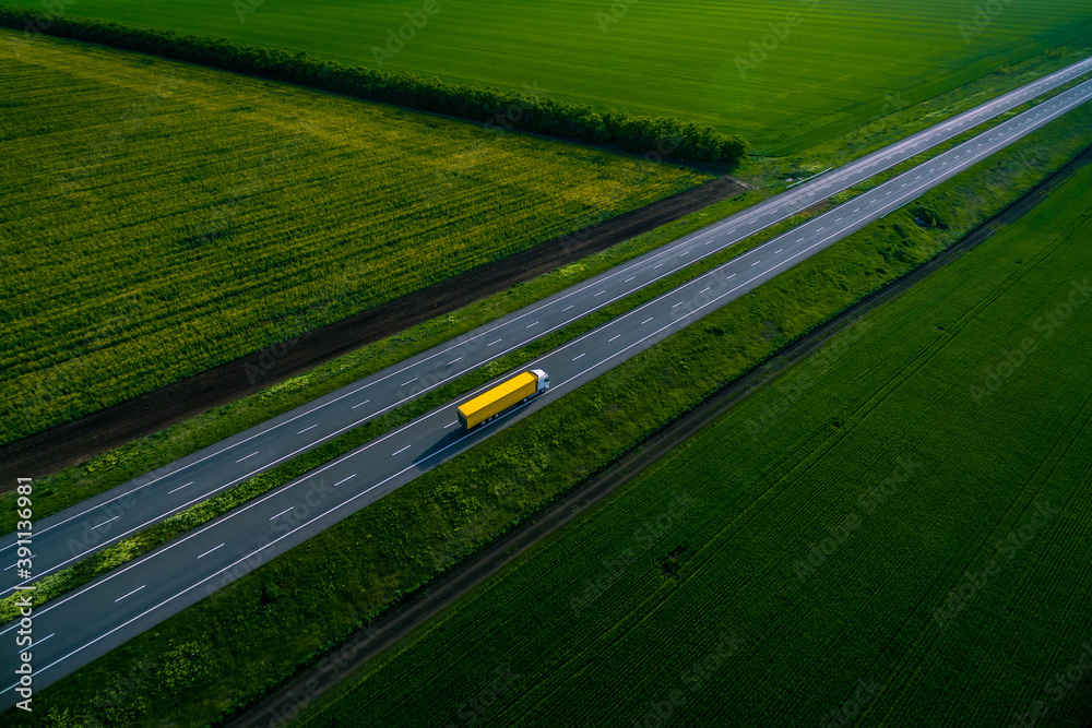yellow truck with container on highway, driving on asphalt road along the green fields. seen from the air. Aerial view landscape. drone photography. cargo delivery cargo transportation