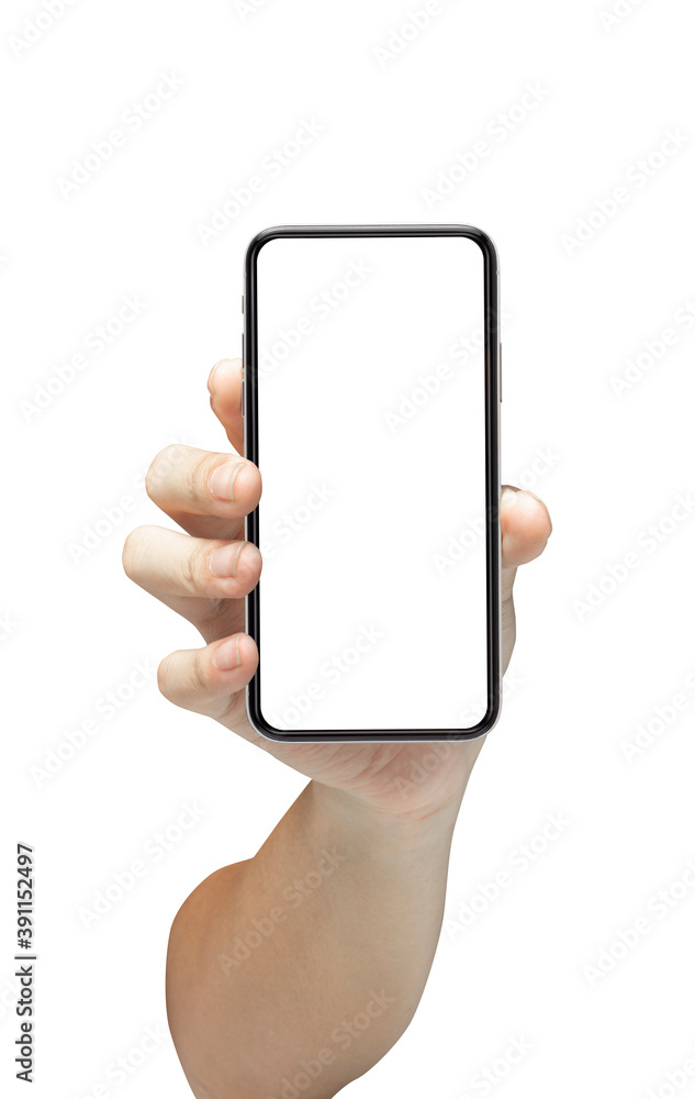 hand holding phone blank touch screen. isolated on white background. Business man hand holding a modern smartphone.