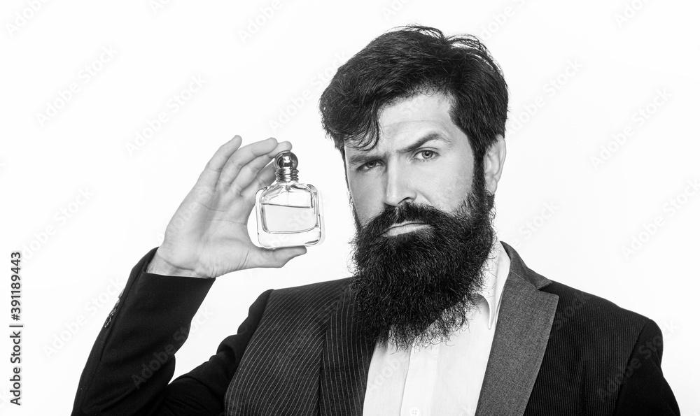 Masculine perfume, bearded man in a suit. Male holding up bottle of perfume. Closeup portrait. Black and white
