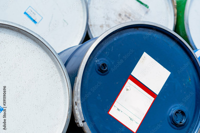 Selective focus on old chemical barrels. Blue oil drum. Steel oil tank. Toxic waste warehouse. Hazard chemical barrel with warning label. Industrial waste in drum. Hazard waste storage in factory.