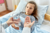 family, health and people concept - mother giving medicine to little sick daughter lying in bed at home