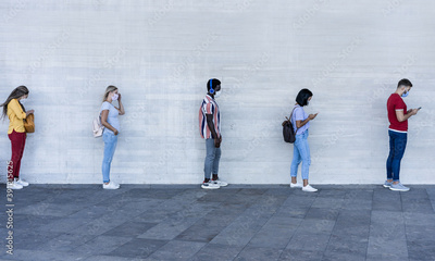 Group of young people waiting for going inside a shop market while keeping social distance in line during coronavirus time - Protective face mask and spread virus prevention - Main focus on black man