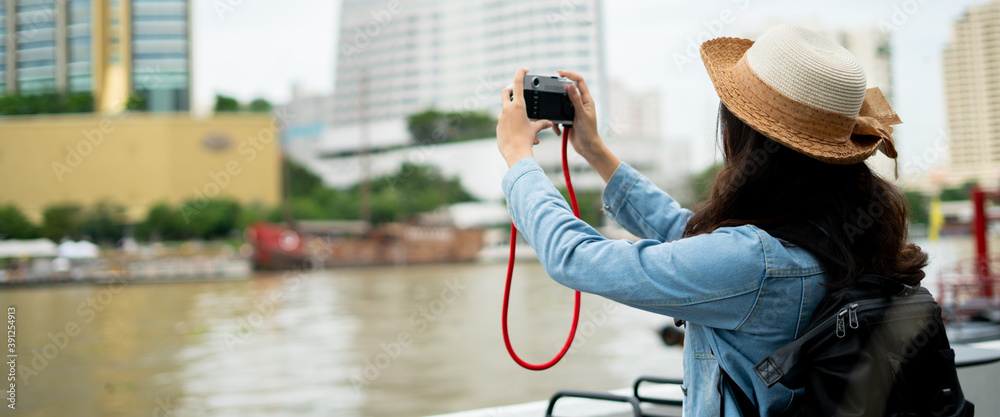 Asian woman wearing face mask when traveling and take photo by boat transportation to prevent covid19 virus infection.Tourist female using smartphone search for route location hotel at thailand
