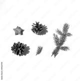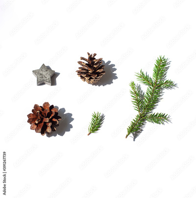 Christmas or New Year concept greeting card on the white background with festive decor. Top view.
