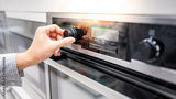 Male hand turning temperature knob of modern oven in kitchen showroom. Buying cooking appliance for domestic kitchen. Home improvement concept