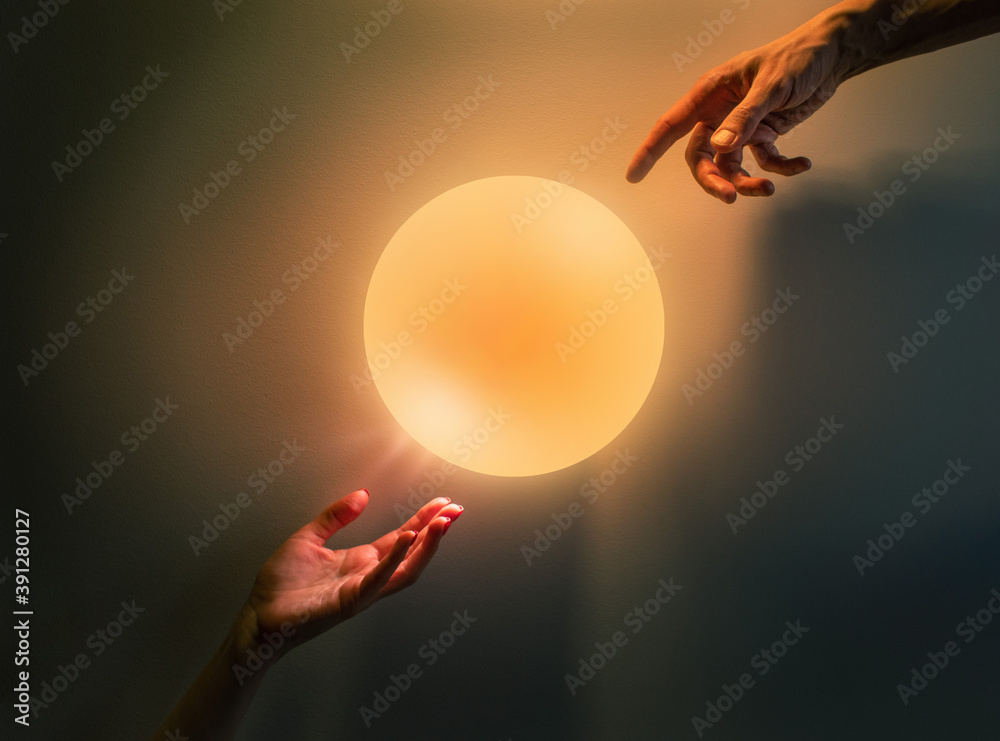 Male and female hands pointing touching glowing light sphere over dark wall background. Creation holiday idea concept.