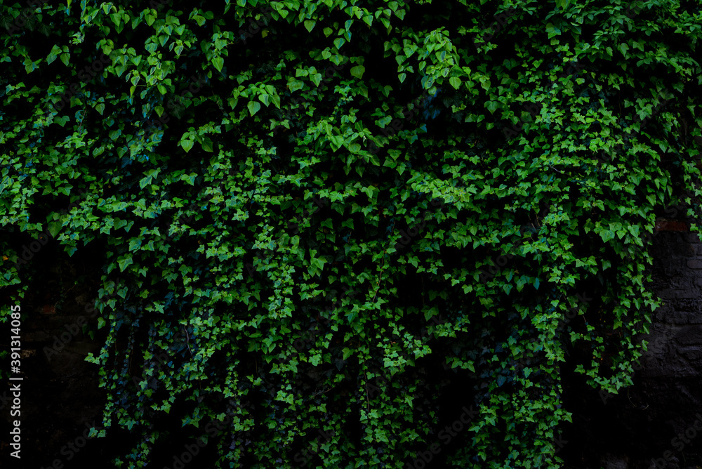 Dark Green toned image of an archival old brick wall covered with lush ivy plants (high details).