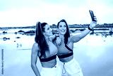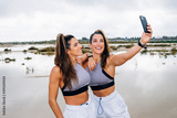 Two beautiful twin sisters using smartphone