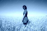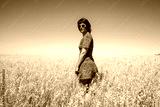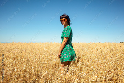 Girl walking through a yellow wheat field with blue sky in spring in a happy state with a green dress