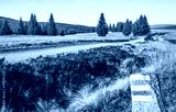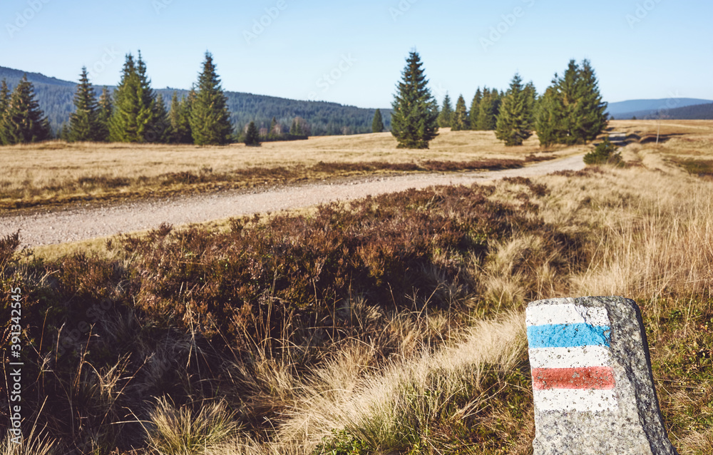 Marked trails on a rock at peatland of the Izera River Valley, color toned picture, selective focus.