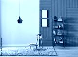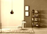 Grey living room, clack lamp and bookshelf, brick wall background and carpet.