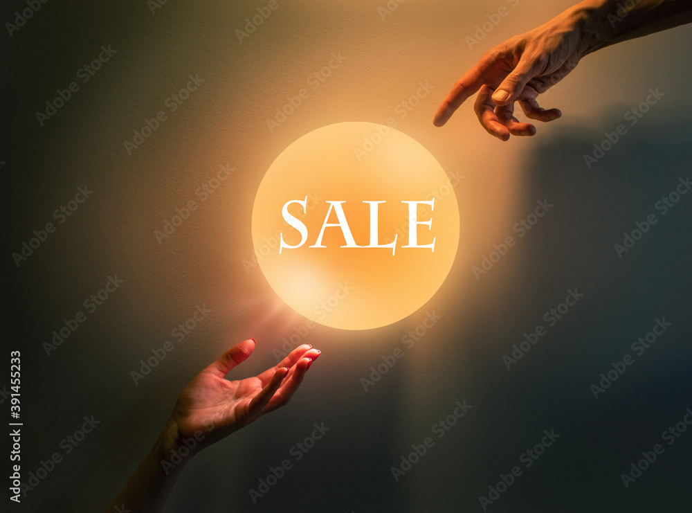 Creation of holiday sale message. Male and female hands pointing touching glowing sale sign balloon over dark wall background.