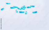 Selective focus on blue capsule pill on white background. Pharmaceutical industry. Pharmacy products. Healthcare and medicine. Blue capsule pills with beautiful patterns. Pharmaceutical manufacturing.