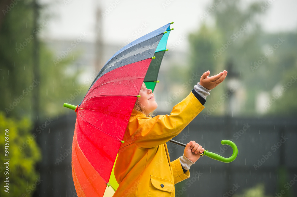 Kid catching rain drops. Happy child girl in yellow waterproof coat and boots holding colorful umbrella. Clothes for playing in rain weather for kindergarten children. Warm autumn or summer day
