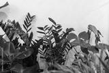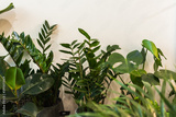indoor and tropical plants with large leaves are in the white interior. palm trees and flowers in natural light