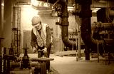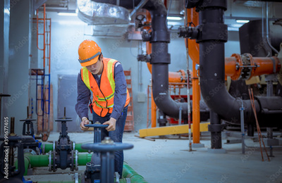 Engineer under checking the industry cooling tower air conditioner is water cooling tower air chiller HVAC of large industrial building to control air system ,wearing mask for protect pollution.