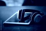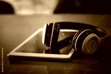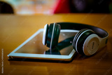 Red wireless earphones Bluetooth put on tablet on the wooden table