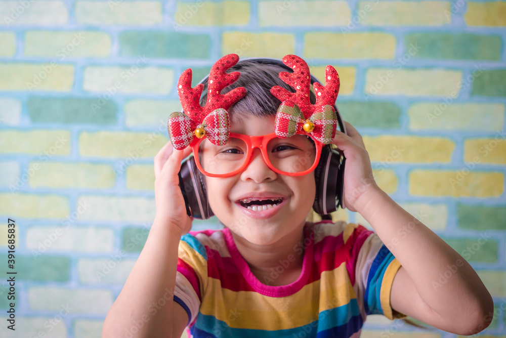 Portrait of cheerful happy girl wearing Christmas deer glass costume, Christmas Hat and show gift boxes on hand with Christmas tree light background.