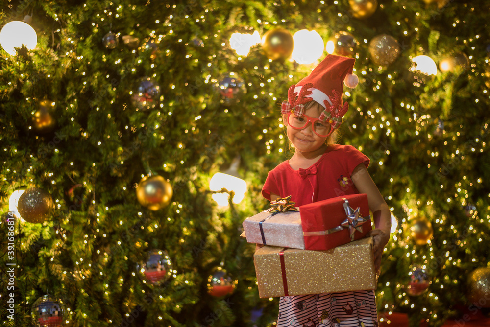 Portrait of cheerful happy girl wearing Christmas deer glass costume, Christmas Hat and show gift boxes on hand with Christmas tree light background.