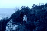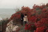 Autumn lovely young couple in stylish clothes is walking on top of hill and holding hands. Autumn time.